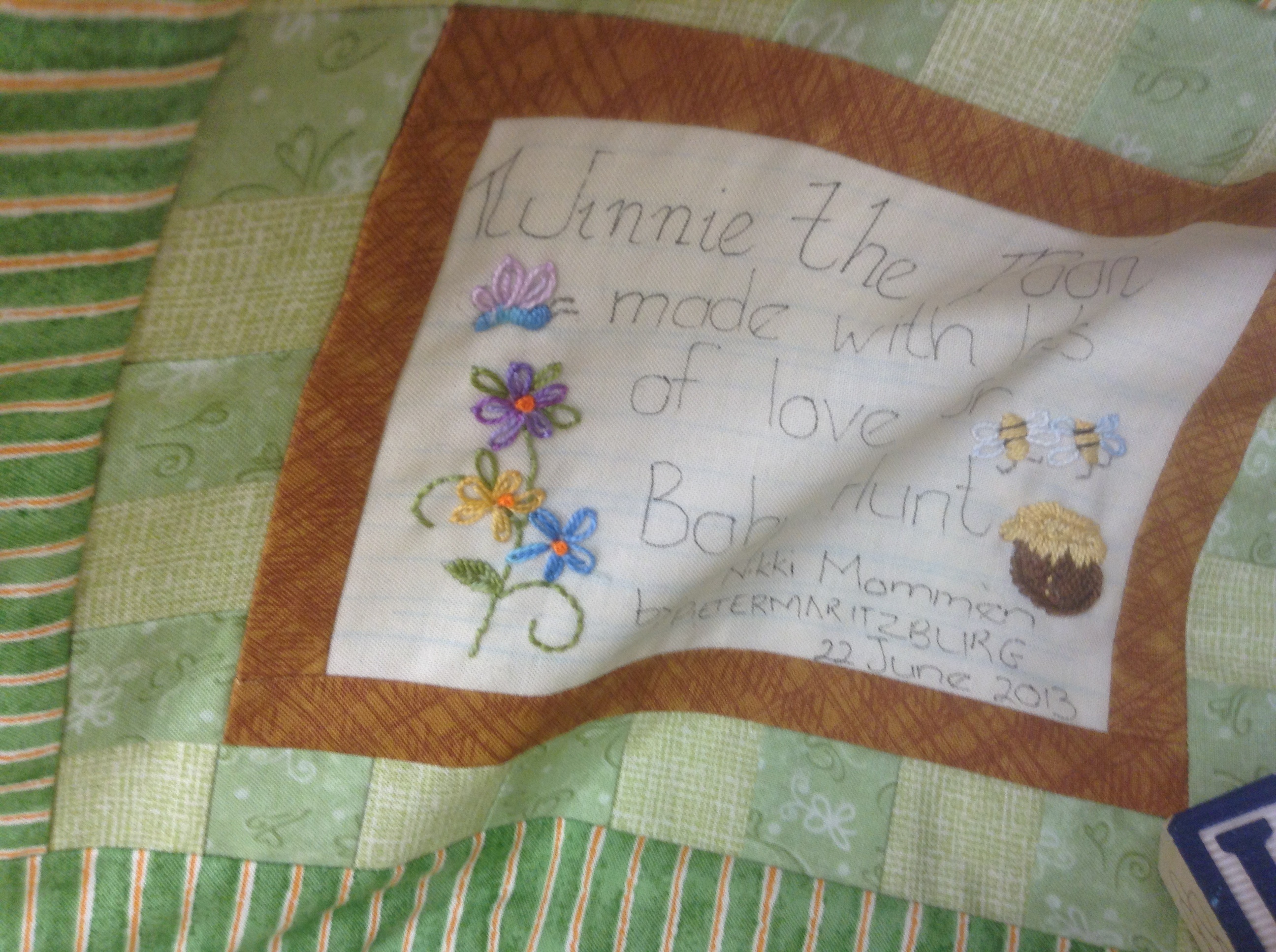 Hot off the needle – Winnie the Pooh quilt label