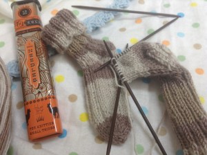 Knitting baby socks with wooden needles